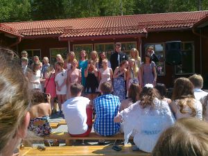 Sen sjunger 9:an en sång till lärarna och skolan, som är så BRA att ögonen bubblar över ändå. Jag får blåstirra ner i knät och försöka stålsätta mej i 180! T o m Mellans pappa viskar att han är rörd av den fina sången.