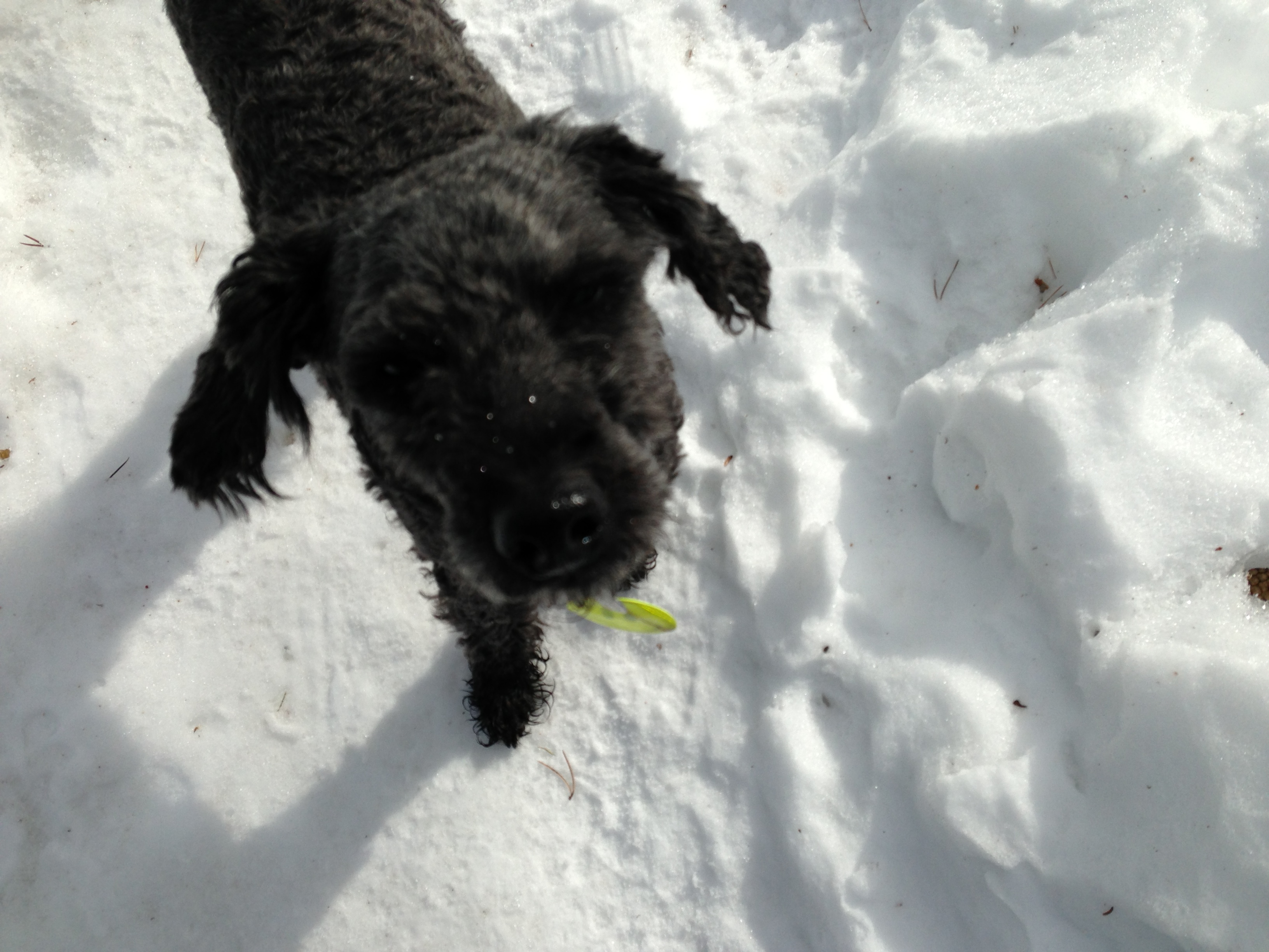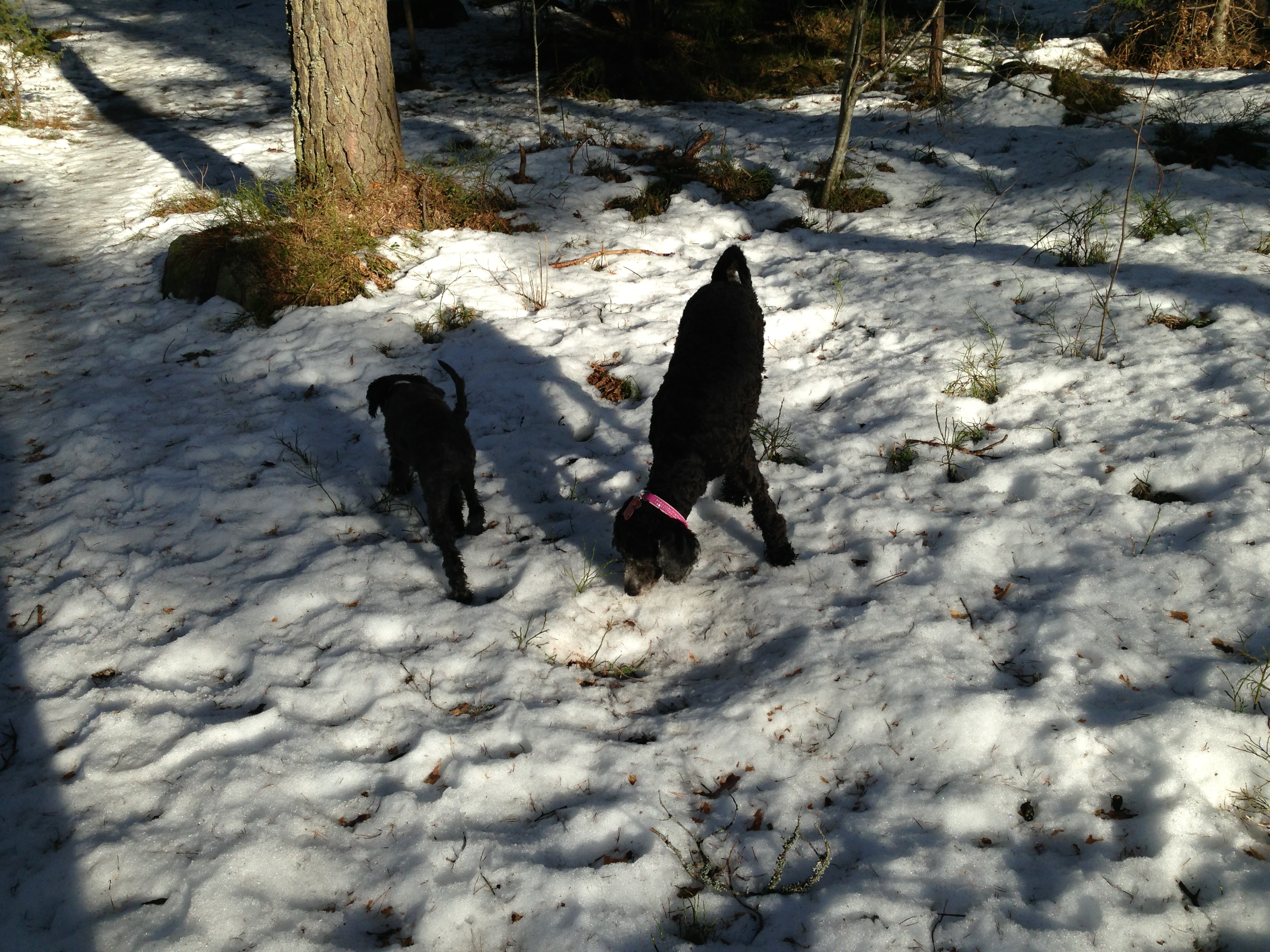 Fiona RUUUUUSAR runt hit och dit! Hon är som en svart blixt som SWISCHAR förbi: ”TJOHOOOOOOO!!!” tror jag hon skulle ropa om hon kunde. Det sprutar snö och vatten och gegga när hon i racerrusar förbi. Ibland funkar inte inbromsningen riktigt: ”TJONG!” Häromdagen flöööög Milton 1/2 meter i luften när hon störtade rätt in i honom. Skrek gjorde han också. När Fiona fått stopp på sin kropp, tittade hon förvånat på honom, skakade på sej och swischade vidare: ”WROOOOOOOOOOM!!!”.