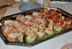 Mamma ställde sej och gjorde såna där små små ”smörgåsar” med en tandpetare nedstucken i. Massor av såna! Av olika sorter. Det var ju superjättesnällt av henne, men jag förstod inte hur jag skulle kunna bjuda på det. Det var ju pinsamt.
