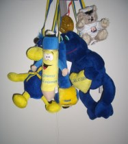 Sen ska man hänga saker runt halsen på sitt barn när det kommer ut från skolan (eller kanske vissa skolor är inomhus?). Det kan vara en nalle, en blomma/blombukett, en påse chips, tuta, visselpipa etc. Bara fantasin sätter gränser, tror jag. Det ska iallafall hängas många saker runt halsen på studenten. Själv har jag inte hängt blombuketter, för vad ska man göra med dom sedan? Eller vill sonen ha en blombukett på sitt rum??