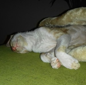 När jag skulle gå och lägga mej kom jag fram till att hundarna skulle få sova hos mej och katterna fick sova hos Minsting (sonen, 20 år, men yngst av fyra, för er som inte vet). Milton la sej vid mitt huvud som vanligt och jag tänkte att Matilda kanske ville ligga på en filt på golvet. Det ville hon inte sa hon med sina ögon (och öron). ”Jaha, du vill sova i sängen?” frågade jag. Hon nickade (nästan). Jag klappade på sängen och sa: ”Kom då!” och hon hoppade nöjt upp och la sej tillrätta vid mina fötter. Sen sov vi som stockar heeeela natten. Såååå skönt och välbehövligt.