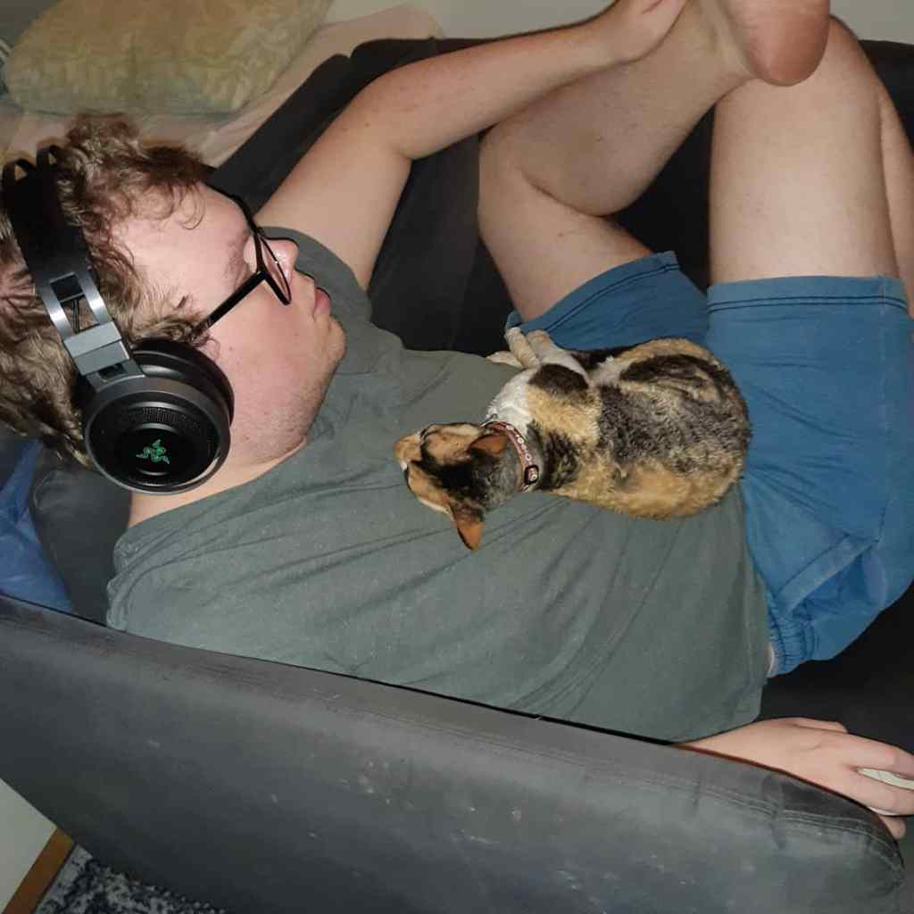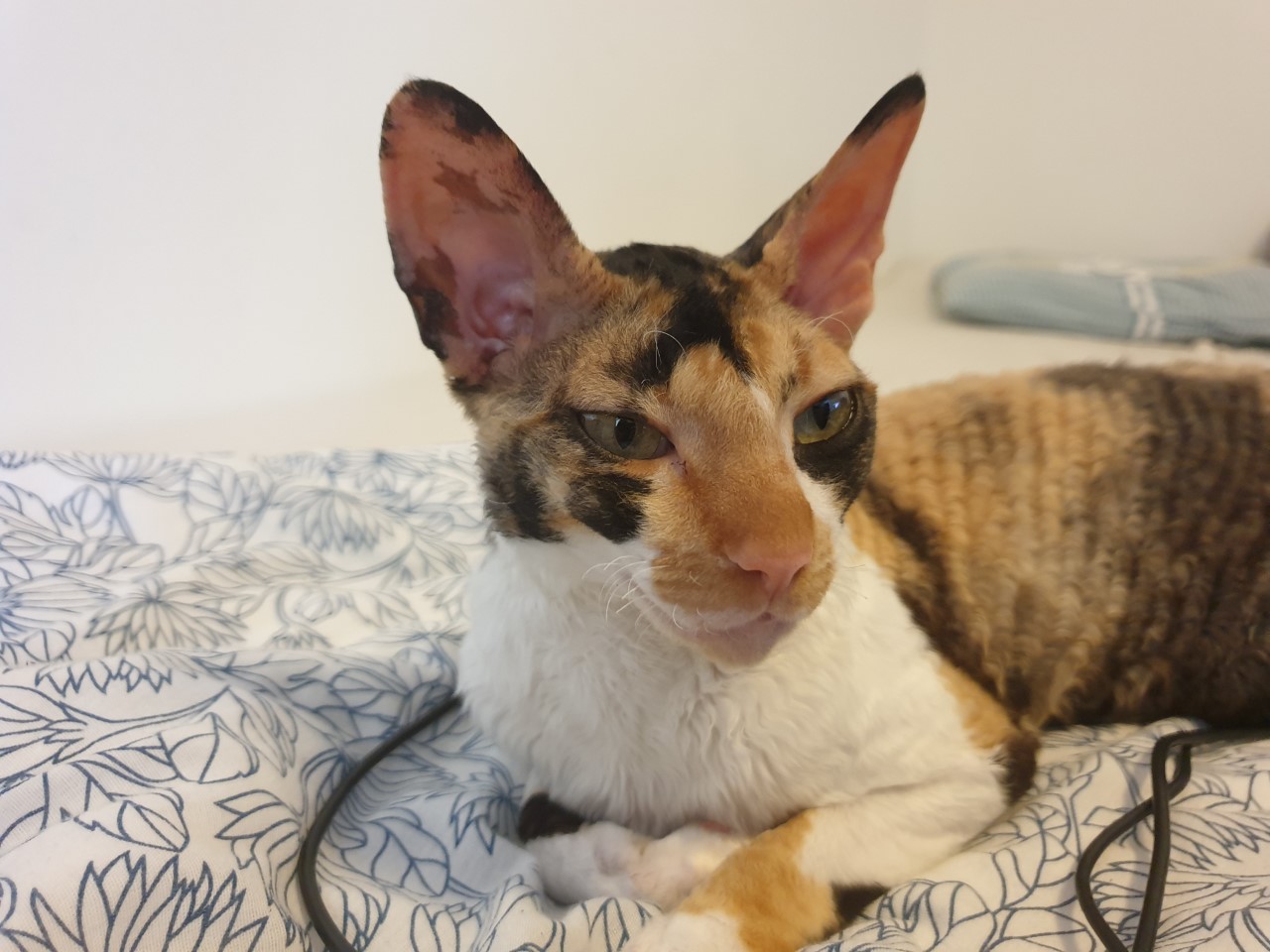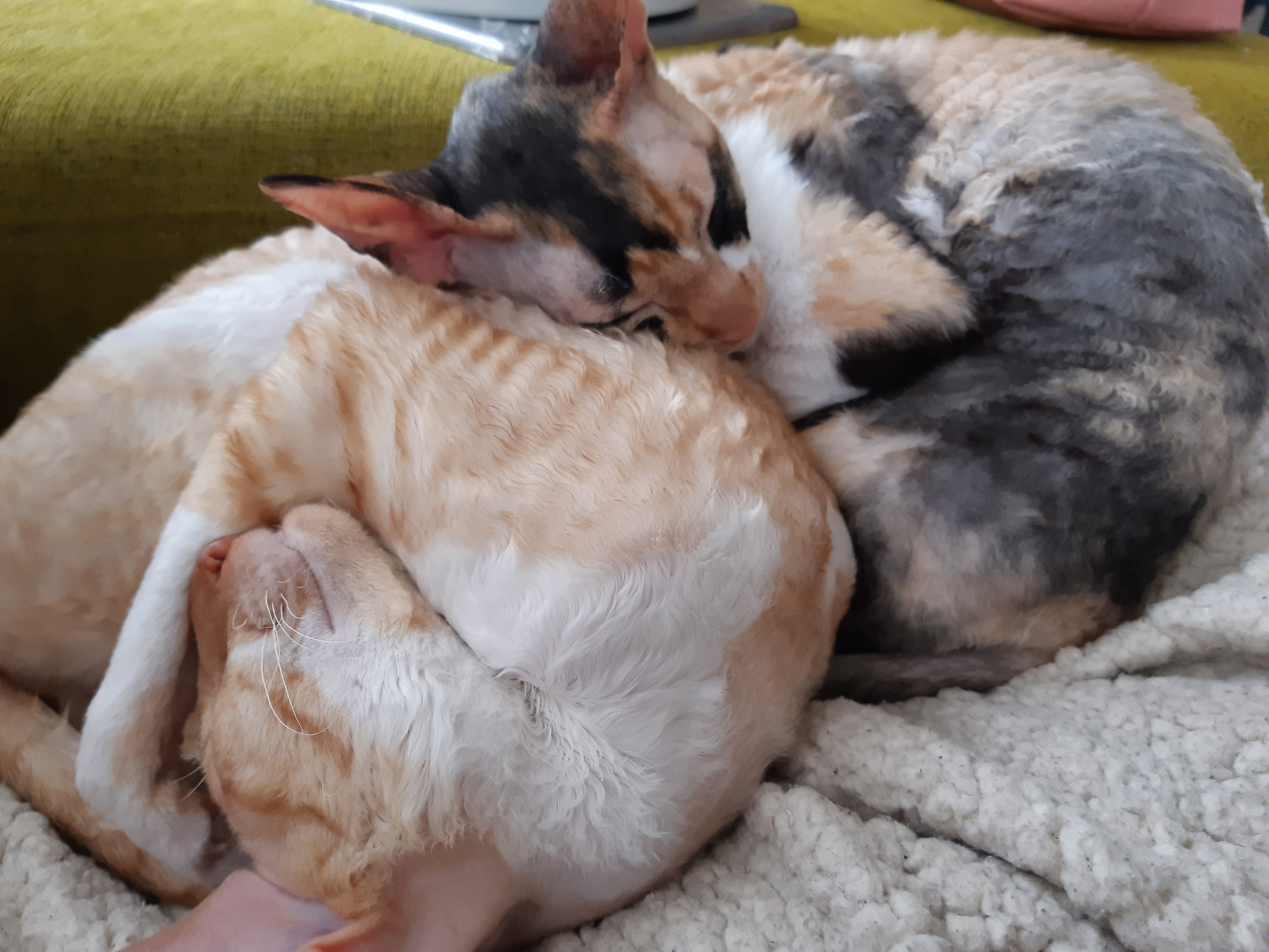 För ca två år sedan flyttade Blinka hem till oss. Hon är av rasen cornish rex och kom från ett katteri, hade fått 2-3 kullar ungar och var ”färdiganvänd”. Hon var 3 år när hon kom. Hon gick nästan direkt in till Minsting och la sig på hans mage och där förblev hon. När jag försökte klappa henne, vek hon undan. Hon bestämde sej helt enkelt från dag ett: ”Minsting är MIN människa.” Sonen, som är uppvuxen med hundar, var nog mest bara förundrad, men accepterade att han blivit utvald till Blinkas egen människa.