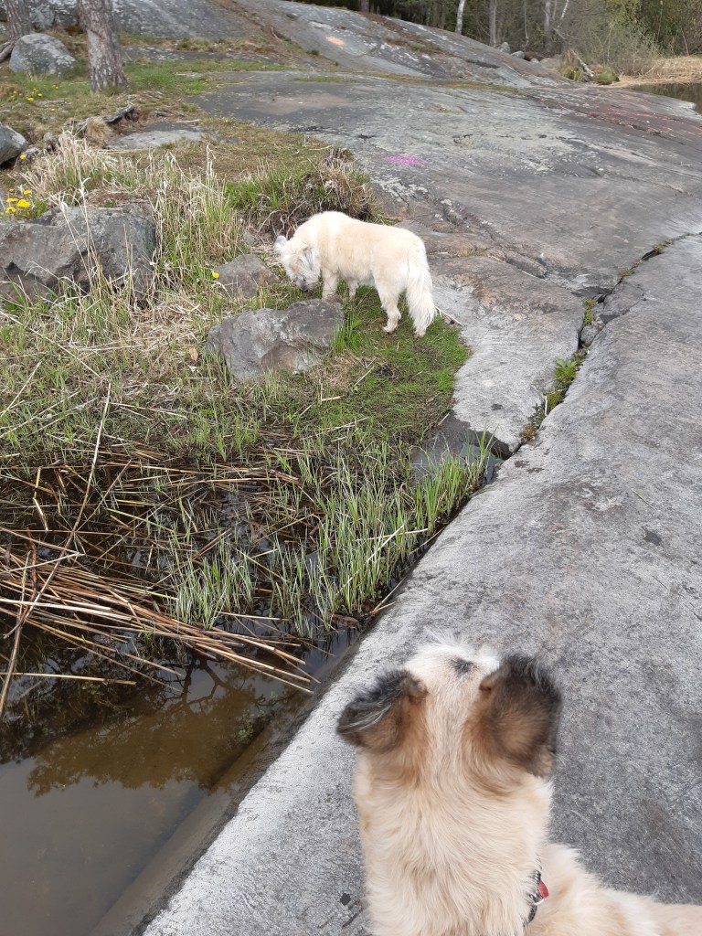 Så gick jag en långpromenad med Corinne och hennes matte (som bott i Skogås 33 år) för någon vecka sedan och så frågade hon om vi ville gå långt. ”Ja”, sa jag. Då sa hon att vi skulle gå runt sjön. Hon ledde, vi följde. Ett helt nytt område uppenbarade sej för mej, vilket inte är konstigt eftersom jag bara bott här i 2 år. Vi gick en fin gångväg utefter sjön och så PLÖTSLIGT sammanfaller den med den gångväg jag gått i 2 år (fast åt andra hållet) och ansett att det plötsligt tar slut. Den tar inte slut. Den fortsätter hela vägen runt! Men för i helvete! Jag fattar inte! HUR kunde den sluta första gången jag gick den och nu gör den inte det?