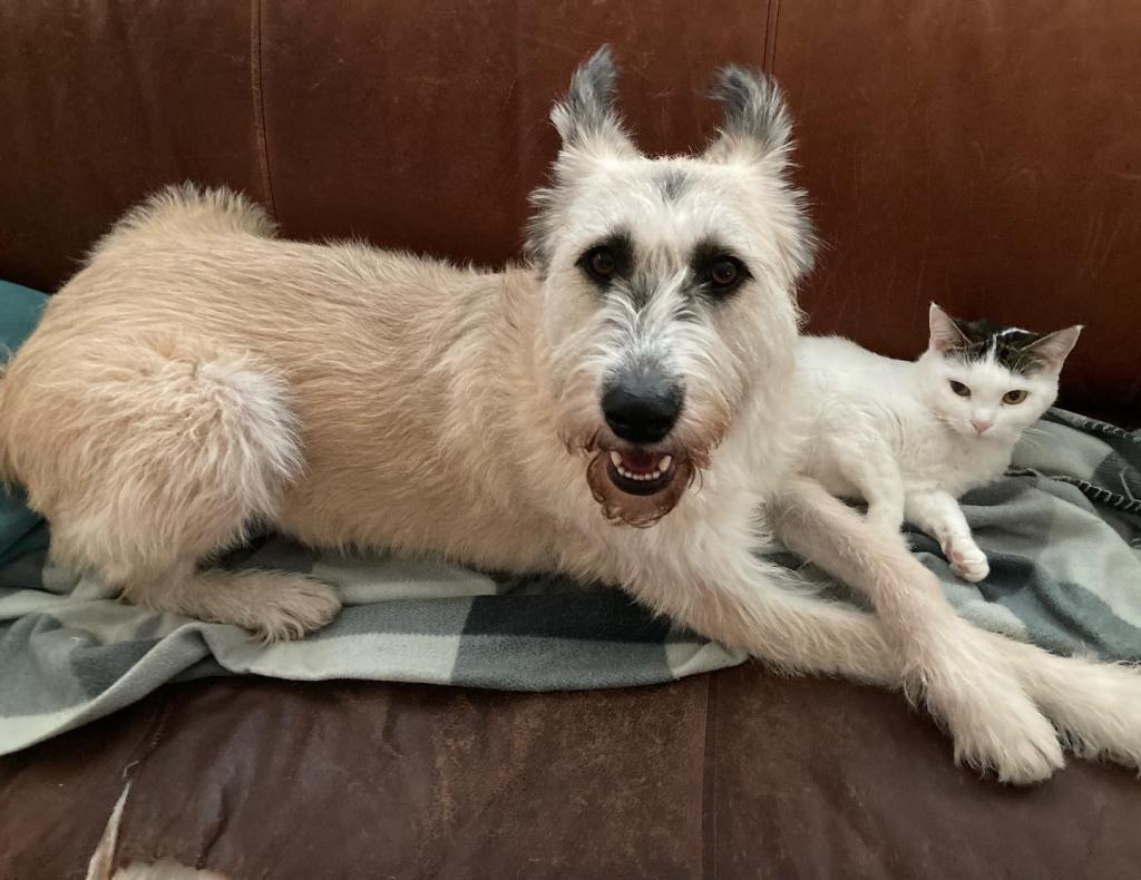 Katterna var väldigt fascinerade i början. Nu ligger Bella kvar när Sugrid kommer så hon ”studsar” mot Bella och byter håll. Ännu har ingen satt sej på henne. Det kanske kommer. Matilda tycker att Sugrid är lite för PÅ, så hon lufsar sakta undan när Sugrid kommer. Elsa tycker att Sugrid är läskig och tror att hon ska hoppa upp i soffan när Elsa ligger där. Jag har försökt säga till Elsa ”ligg kvar. Hon kommer inte upp i soffan”, men Elsa litar inte på mej och springer iväg när Sugrid kommer nära soffan där Elsa ligger och jag sitter.