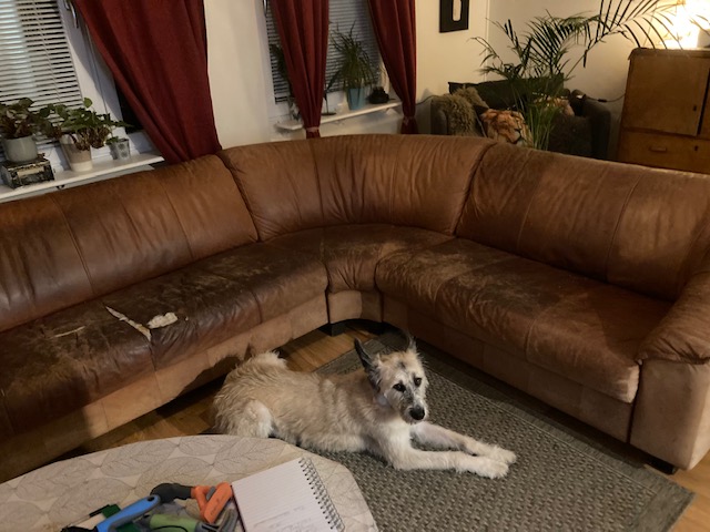 Jag skrev ett inlägg om en buffelhuds-hörnsoffa, som jag lääängtat efter i 40 år. Den är nu klarsutten. Och längtan gick över. Skönt. Den hade två-tre hål i sej som jag ”lätt som en plätt” skulle laga. Först tänkte jag att jag skulle ta fram min ”läder-nål” som jag var säker på att jag hade – en sån där böjd och grov nål, som jag VET att jag haft, eftersom jag en gång i tiden sydde mjukisdjur. Jag sydde bl a en hund till en killkompis. Den blev jättefin! Den böjda nålen finns inte mer. Den har flyttat. Vart vet jag inte. Men den finns inte kvar. Inte heller killkompisen. Han dog för ett par år sedan. Jag undrar vart hunden tog vägen?