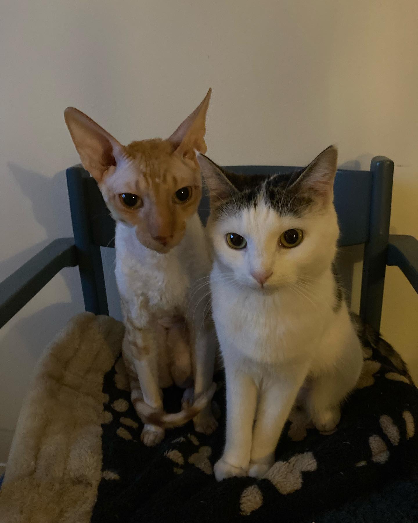 Jag sitter på altanen och Theo får inte vara med. ”MJAOOO!” säger han och krafsar på dörren. ”MJAOO!”