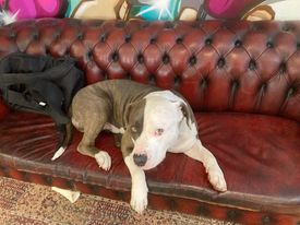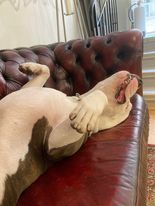 Det första jag såg när vi kom dit var en hund. Och jag tänkte ”Ödet; Det var Meningen att vi skulle gå just hit” och så satte jag mej med hunden som hoppade upp bredvid mej i den röda lädersoffan och så gosade vi tills han rullade runt på rygg och ”svimmade”… ❤