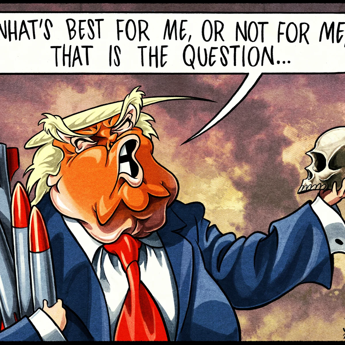 Jag är rädd för att hans egoistiska, barnsliga, livsfarliga, psykopatiska och narcissistiska beteende ska leda till att han antingen trycker på Knappen som får en atombomb att fara över världen och landa någonstans och förstöra allt eller att han får alla länder att börja kriga i ett livsfarligt World War III.