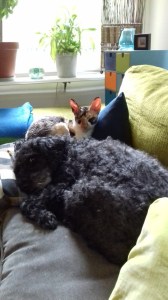 När jag skulle gå och lägga mej kom jag fram till att hundarna skulle få sova hos mej och katterna fick sova hos Minsting (sonen, 20 år, men yngst av fyra, för er som inte vet). Milton la sej vid mitt huvud som vanligt och jag tänkte att Matilda kanske ville ligga på en filt på golvet. Det ville hon inte sa hon med sina ögon (och öron). ”Jaha, du vill sova i sängen?” frågade jag. Hon nickade (nästan). Jag klappade på sängen och sa: ”Kom då!” och hon hoppade nöjt upp och la sej tillrätta vid mina fötter. Sen sov vi som stockar heeeela natten. Såååå skönt och välbehövligt.